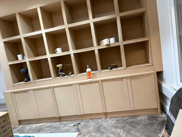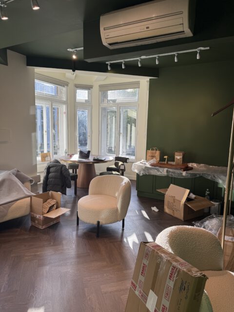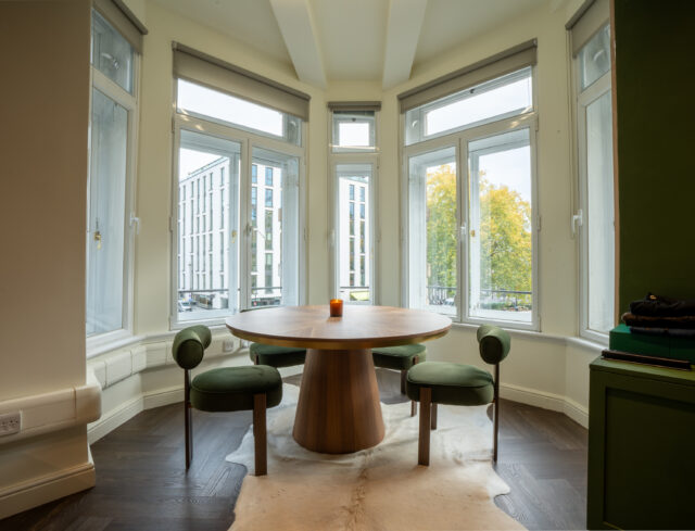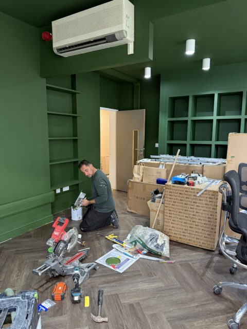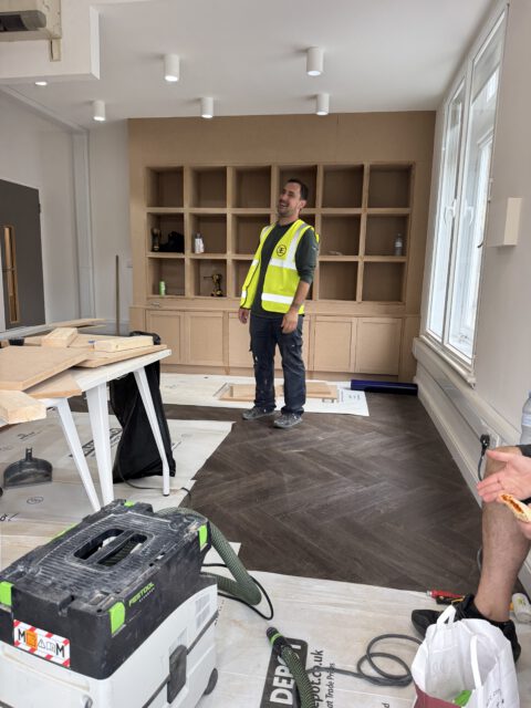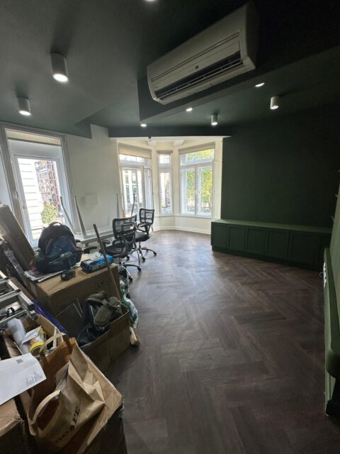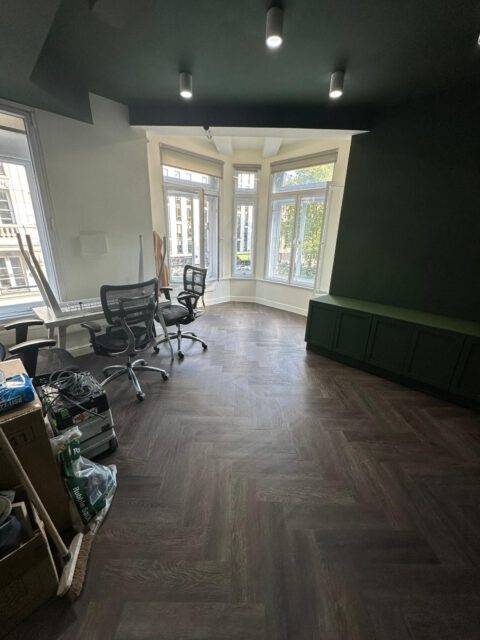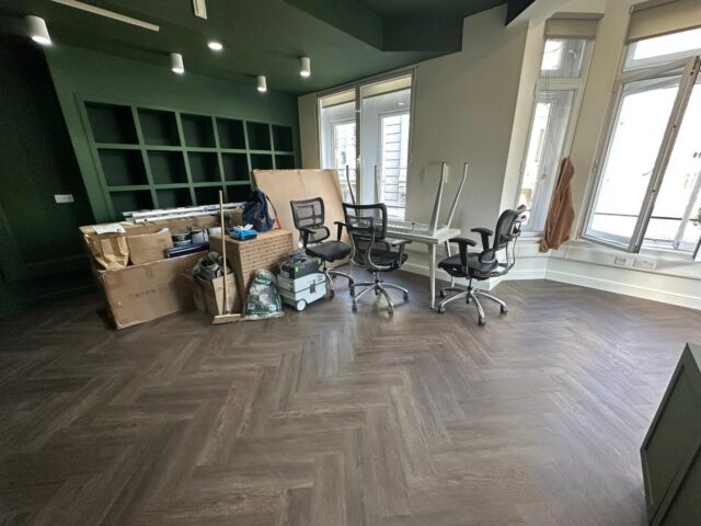 The refurbishment began with a full internal strip-out, preparing the space for complete redesign and reconfiguration. New flooring was installed in a herringbone finish, creating a strong visual foundation for the interior scheme.