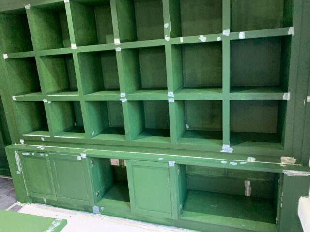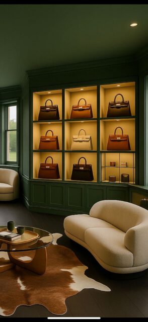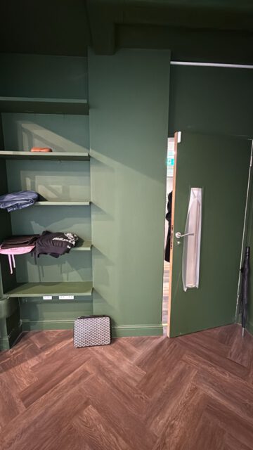 Bespoke joinery was designed and installed throughout, including custom-built shelving units and illuminated display cabinets to showcase products effectively. Deep green feature walls were paired with integrated lighting systems to enhance both ambience and product presentation.